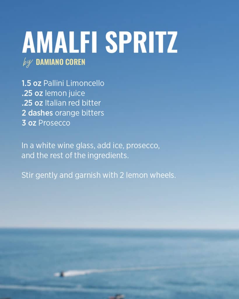 Micaela Pallini emphasizes that their limoncello, their Limonzero, and the company’s related liqueurs are not “add-ons” but the very heart of the business, a focus that has earned the brand deep respect and loyalty within the trade. For example, in 2023, Roman-born bartender Damiano Coren used Pallini Limoncello to create the “Amalfi Spritz” (see recipe below) at New York’s famed Felice restaurant, a cocktail that proved so popular it’s now featured across all Sant Ambroeus Hospitality Group locations.